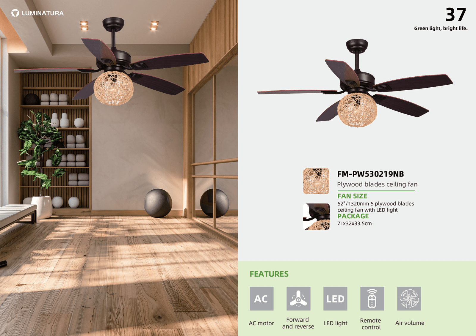 Blades: 5 plywood blades, adding a natural and cozy style to any environment.